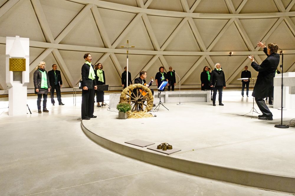 Nach der Begrüßung durch den Pfarrgemeinderats-Vorsitzenden Matthias Hefter betraten die Sängerinnen und Sänger zunächst mit Maske den Altarraum und nahmen ihre Plätze im weiten Rund der schlichten, modernen Kirche ein. St. Josef mit Leben füllen, das ist die Intention der Pfarrgemeinde. Und auch an diesem Oktoberabend gelang sie wieder beeindruckend. Abstand einhalten gebieten die Corona-Regeln und sowohl Chor wie Zuhörerschaft halten sich konsequent daran.
